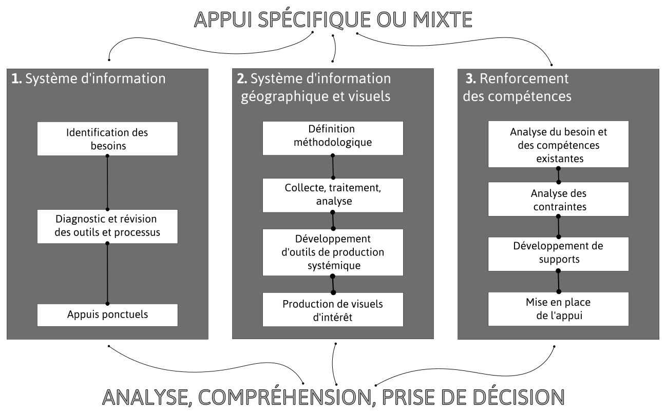 Aussi, le service proposé se décompose en trois approches complémentaires pour répondre à cette problématique et repositionner la gestion de données au service de l’action humanitaire.